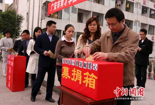 中新網成都4月26日電(廖小兵 王天青 曾一瑩)在“4.14”青海玉樹大地震中,四川廣安區龍安鄉文林村四組村民張朝清、聶文蘭夫婦雙雙遇難,留下遺孤張成與72歲的奶奶相依為命。消息傳來,愛心如潮,廣安區各界人士紛紛伸出援助之手。26日8時許,在廣安城南新區的育才學校校園內,師生們為紛紛慷慨解囊,當場收到捐款15100.90元。
