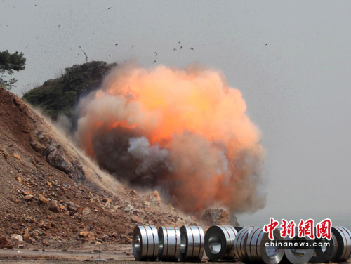 中新網九江4月28日電(胡國林 李濤淵)“一、二、三”,隨著一聲令下,4月27日中午,在江西九江都昌縣磯山湖附近一偏僻的時子山腳下,立即出現一個巨大的“火球”,原來,這里正在實施銷毀日軍侵華時期遺留下來的炮彈。