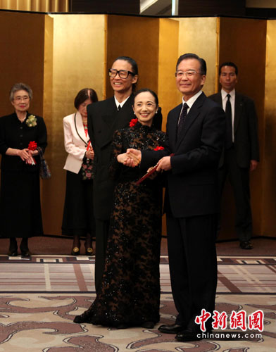 除了池田,獲獎的還有松山芭蕾舞團,前來領獎的是松山芭蕾舞團第二代當家,總代表清水哲太郎和森下洋子夫婦。森下洋子見到溫總理,行了一個芭蕾式的驅腿見面禮,她對溫總理說:“我演過白毛女喜兒!”。溫總理微笑著點頭,說:“我記得你,歡迎你再來中國演出,這也是中國人民的心愿。”