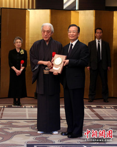 溫家寶總理說,今天這個頒獎儀式非同尋常,中日邦交正常化走過了一場艱難曲折的道路,在這過程中,起重要作用的是人民和朝野的力量。你們才是中日關系發展的功臣,歷史將記住你們,中日兩國人民將記住你們,我代表中國政府和中國人民謹向你們表達崇高的敬意和深深的謝意。