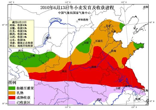 目前,安徽中北部、江蘇大部、河南中北部、陜西南部和關中、甘肅隴南、山西西南部、山東西部和南部、河北南部、新疆西南部冬小麥處于成熟收獲期;山東中東部、河北大部、山西南部、陜西中北部、甘肅隴東大部、新疆南部偏東地區冬小麥處于乳熟期;山東半島東部、河北東北部、山西中部、甘肅隴中和隴東西北部、新疆北部冬小麥處于抽穗至灌漿階段。