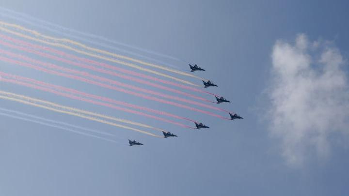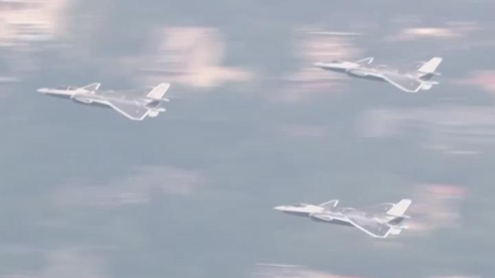 空中梯隊完整視頻丨呼嘯而來!戰機拉出14道彩煙象征14年抗戰
