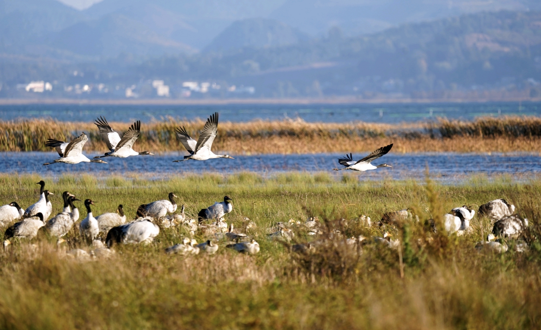 鶴鳴九皋,聲聞于野。進入11月,貴州高原最大的淡水湖泊——草海陸續迎來“高原仙子”黑頸鶴到此越冬。