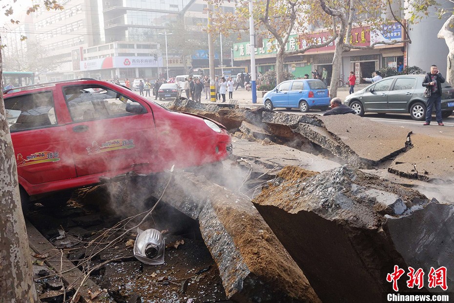 青島中石化一輸油管線發生破裂起火 路面被掀翻