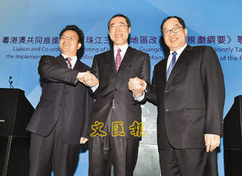 粵港澳三地政府19日在香港舉行共同推進實施《珠江三角洲地區改革發展規劃綱要》聯絡協調會議,唐英年、廣東省副省長萬慶良、澳門特區經濟財政司司長譚伯源率領三方官員,就如何落實《綱要》中有關粵港澳合作的部分,進行深入討論。中聯辦副主任郭莉也出席會議。