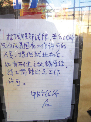 報道指出,在7日執法行動中有一名石姓女子被捕的中日職業介紹所仍繼續關門,8日一早門上就張貼出中英文告示,明確告訴找工者必須有工作許可證。