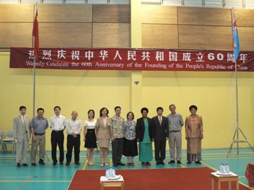 中新網9月24日電 據中國駐斐濟大使館消息,9月18日,由在斐華人創辦和管理的斐濟名校——逸仙學校舉辦慶祝中華人民共和國成立60周年升旗儀式和文藝活動,韓志強大使應邀出席并講話。斐華人教育協會會長余倩莊、逸仙學校中小學師生代表700余人參加。