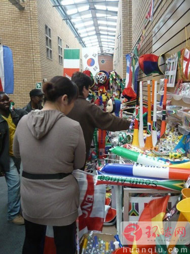 穿行在這里的商鋪之間,安全感和親切感倍增,到處是黃皮膚黑頭發(fā),還有不時會飄送過來的鄉(xiāng)音。商城中的狂歡氣氛相當(dāng)濃重,所有的走道里扎滿了世界杯32強(qiáng)的國旗。商鋪中最受歡迎的也是售賣世界杯相關(guān)商品的,每走幾步,就可以看到許多非華人的買家聚集在售賣球衣、球服、大喇叭的攤位前問價,而站在旁拍照的記者,竟因?yàn)殚L著華人的面孔,被屢屢誤認(rèn)為是老板,遭問了不下十幾次“這個值多少錢?”實(shí)際上,世界杯官方的球衣和紀(jì)念品幾乎全都是中國制造的,當(dāng)然,百家商城里出售的商品多數(shù)是沒有授權(quán)的“山寨版”,比正版貨的價格便宜數(shù)倍,因此南非各地的人,也有不少專程跑到中國城來批發(fā)便宜貨。看來,世界杯又能讓南非華人大賺一筆了。(底婕)