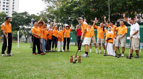 天氣晴朗,在碧山大牌279附近的鄰里公園,一群穿橙黃色隊服者愉快而閑適地打著木球(woodball)。他們是碧山—大巴窯北(Bishan-Toa Payoh North)木球隊,這個小巧的練習場和旁邊的食閣,已然是他們的大本營。