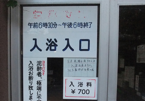 有一回路過京都一處公共浴池,看到一張雷人的小紙條,并同“拒絕醉漢入內(nèi)”一起貼出來。上面寫的是“謝絕不滿1周歲的未成年幼兒入浴,因?yàn)榘l(fā)現(xiàn)他們在里面老拉巴巴!”