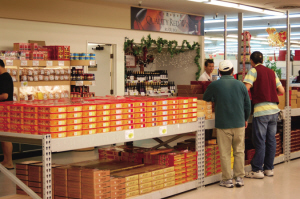 洛杉磯的各個華資的超級市場上,來自中國各地的月餅應有盡有。圖為剛剛準備上市的中秋月餅檔口。(美國《僑報》/蔚宇攝)