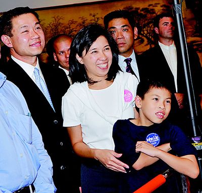 盡管票數(shù)未達(dá)40%的法定下線,劉醇逸支持者的心情絲毫不受影響,隨著各地傳來的捷報,支持者們的心情也跟著激昂。晚間10時45分,劉醇逸牽著妻子李迪儀、八歲兒子劉正龍一出現(xiàn)在會場,現(xiàn)場“John Liu!”呼聲不斷,將整場情緒帶到最高點(diǎn)。