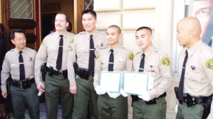 上午10點畢業(yè)典禮開始,洛縣警局局長李貝卡親自為70名新警員頒發(fā)畢業(yè)證書,在這些人當(dāng)中,有4人是亞裔,其中包括一名韓裔、一名越裔和兩名華裔,這兩人分別是26歲的何青源和25歲的陳得光。兩人在家人和朋友的簇?fù)硐嘛@得格外的自豪,并在洛縣警局華裔警官何思棋的陪同下一起合影留念。