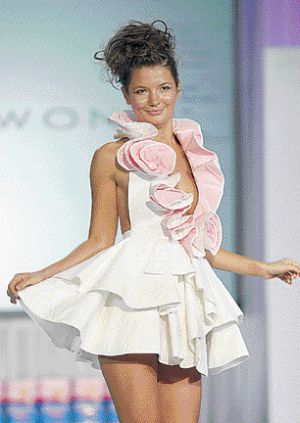 黃嘉宜是來自溫哥華的設計師。學時裝設計的她,在兩年前擁有了自己的時裝公司。她的設計以性感、女性主義和現代感著稱。她表示,在用廁紙設計時裝時,首先想到的是要給觀眾一種很難相信這衣服是用廁紙制成的感覺。因此,她特地要體現出與廁紙的柔軟相反的一種挺括的質地,于是要在廁紙下加硬襯。結果是,她的設計本身就有一種雕塑般的感覺。