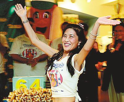 看過李蕙比賽的人都難以理解:她五尺出頭、腰細(xì)得只能穿零號牛仔褲的小女子,怎么能和那些五大三粗的猛男們競爭大胃王的寶座?不論是連續(xù)兩年在紐約著名的國慶節(jié)吃熱狗大賽中,還是在各地的競吃賽場,觀眾們對參賽的大漢們興趣平平,但對身穿露肚臍短款T恤、腰間沒有半點松皮和贅肉的44歲辣媽卻情有獨鐘,都爭先恐后與她拍照留念。