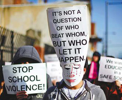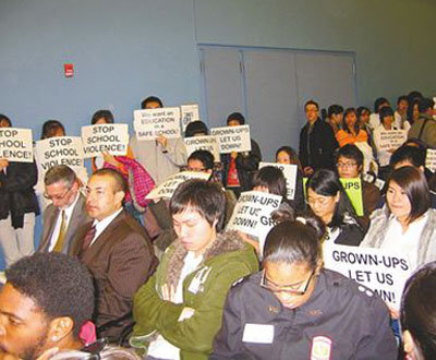 南費(fèi)城高中亞裔學(xué)生、家長和華埠小區(qū)領(lǐng)袖百余人,9日下午手持“是誰讓它發(fā)生”等抗議標(biāo)語,游行至教育局參加公聽會,游行者高喊“停止學(xué)校暴力”、“給我安全教育環(huán)境”,抒發(fā)壓抑多時的不滿。