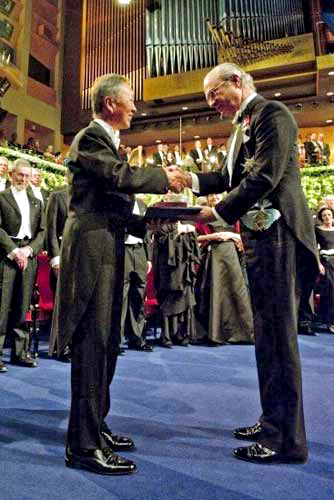 頒獎當天共有8人上臺領獎,高錕被安排在第一個。瑞典國王卡爾十六世—古斯塔夫破格走向高錕站立處為他頒獎,彼此親切握手致意。高錕從容自若,滿臉笑容從瑞典國王手中接過諾貝爾物理獎狀,場面相當溫馨。