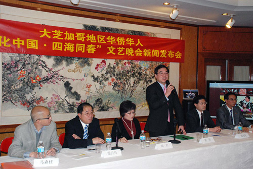黃屏總領事在大芝加哥地區華僑華人“文化中國•四海同春”文藝晚會新聞發布會上講話。(《芝加哥華語論壇》張大衛攝)