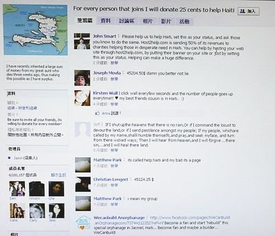 事實上,王Jason并不是唯一發起該行動的人或組織,在Facebook網站,在搜索欄輸入英文Haiti,就會顯示2800個相關搜索結果,有的群組主旨和王Jason發起的類似,比如“該群組每加入一個人我就捐0.05美分幫助海地”、“該群組每加入一個人我就捐10美元幫助海地”,區別只是捐助金額的不同,但目前加入王Jason創立的群組人數最多。