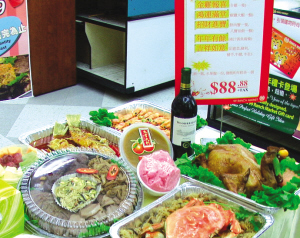 經(jīng)濟(jì)不好,團(tuán)年飯改在家里吃吧!大華超市公關(guān)經(jīng)理曹其崢表示,他們根據(jù)市場(chǎng)的判斷,認(rèn)為許多華裔人士會(huì)追求經(jīng)濟(jì)實(shí)惠的家庭套餐,如果可以讓他們?cè)诩依锞涂梢宰聿宛^的美食,將會(huì)受歡迎。因此,他們推出了力求薄利多銷(xiāo),“百元有找”的新春套餐。新春套餐以“金雞報(bào)喜”、“鴻運(yùn)滿(mǎn)堂”、“招財(cái)進(jìn)寶”、“年年有余”等吉祥話(huà)命名,包括全雞、大蝦、肉蟹、黃金魚(yú)及魯菜拼盤(pán),另外贈(zèng)送紅酒、水果盤(pán)、發(fā)糕及年糕,全部套餐只要88.88元。