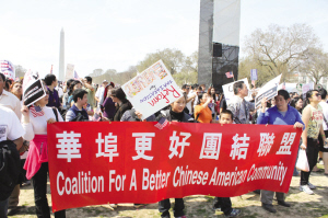 估計有1千多華人參與了21日下午在華府國家廣場舉行的移民集會和游行,這是近年來華人參與移民權(quán)益游行最踴躍的一次。