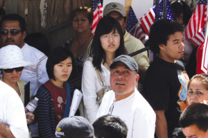 在當天的萬人移民大游行當中,記者只看到了由十幾個人組成的韓裔示威者,他們一路打著手鼓,敲著鐋鑼,走在游行隊伍當中。與其他人不同的是,他們的帽子和背心上都印著2010年人口普查的宣傳廣告,讓很多圍觀的民眾一時弄不清這伙人游行的真正目的到底是什么?因為當天洛杉磯各地也恰好都在舉行人口普查的“填表日”活動。