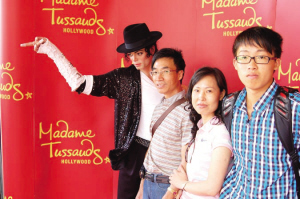 來自深圳的商人陳小興、周娥夫婦是帶著兒子陳曉灝來美看學校的。陳小興說,從幼年起,麥克爾·杰克遜就是自己的偶像,今天在美旅游途中能看到他的蠟像很幸運。天津漢沽一中的高中生王冠一是同父母及外婆來美旅游的,他表示,很新歡麥克爾·杰克遜。從北京來美旅游的袁宗陽、朱瑞龍夫婦,看到麥克爾·杰克遜的蠟像興奮不已,竟然兩次排隊與蠟像合影。