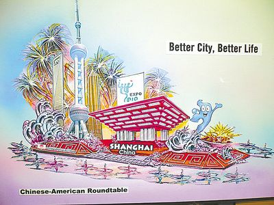 參加明年元旦玫瑰花車游行的上海世界博覽會花車“更好的城市,更好的生活”設計圖。