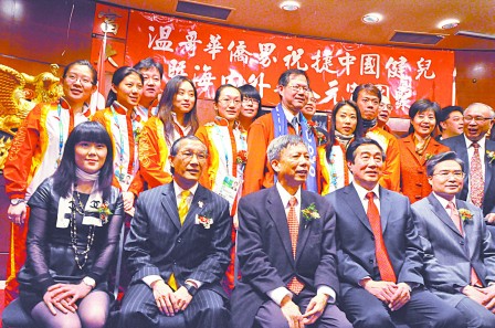 500多名僑界代表當日共同守候功臣們的到來,奪金的花樣滑冰雙人滑選手申雪和趙宏博剛到場,便受到英雄和明星式的待遇,從進場到坐下便好像“手握不完、相影不完、名簽不完!彪S后,王冰玉、周妍、岳清爽和柳蔭這冰壺4姐妹入場,又引發(fā)新一輪高潮,場面極為熱鬧,閃光燈亮個不停。