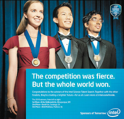 英特爾在廣告中的標題及內容都很簡單。標題為“科學獎競爭激烈,贏家是全世界。”廣告內容指出,恭賀所有在英特爾科學獎的優勝者及進入最后準決賽參賽者,他們創造了更光明的未來。