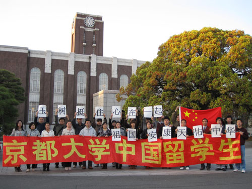 中新網(wǎng)4月20日電 據(jù)日本《關(guān)西華文時(shí)報(bào)》報(bào)道,4月18日,日本京都大學(xué)和廣島大學(xué)中國(guó)留學(xué)生學(xué)友會(huì)舉辦各種活動(dòng),為青海地震遇難者祈福。日本京都大學(xué)的中國(guó)留學(xué)生在京都大學(xué)廣場(chǎng)高舉五星紅旗和條幅“玉樹(shù)挺住,心在一起,祖國(guó)安康,天佑中華。”廣島大學(xué)中國(guó)留學(xué)生學(xué)友會(huì)的留學(xué)生點(diǎn)燃蠟燭為青海地震遇難者祈福。(渡邊)