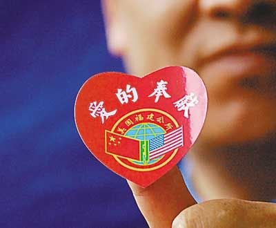 福建公所主席鄭時甘在東百老匯的募捐攤位上向每位捐款的民眾贈送一張印有“愛的奉獻”字樣和福建公所標志的紅色心型貼紙,一方面表示對捐款者的感謝,一方面希望僑胞能將貼紙傳遞給更多華人,使更多民眾為青海災區獻上愛心。