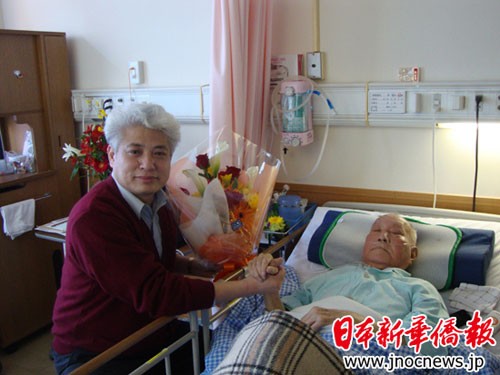 《日本新華僑報》總編輯蔣豐在2010年新年到來之際前往醫院探望李海天老先生。(日本新華僑報網圖片)