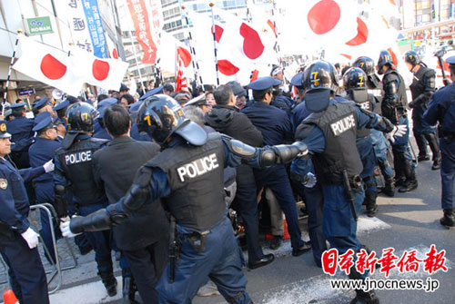 當(dāng)他們在警崗前叫嚷結(jié)束后,準(zhǔn)備前往“陽光城”物產(chǎn)店前騷擾搗亂。這個時候,警方機(jī)動隊一擁而上,將他們團(tuán)團(tuán)圍住,并且在四周設(shè)立了鐵欄障礙。他們發(fā)瘋般狂喊口號,做著“突圍”的動作。警方機(jī)動隊絲毫不為所動。一輛寫著“以恢復(fù)主權(quán)為目標(biāo)之會”的面包車開了過來,跳下一個小頭目高喊:“我們?nèi)コ卮焓鹂棺h!我們申請后拿到了許可,為什么不允許我們?nèi)ィ俊比缓螅麄兎稚㈥懤m(xù)前往池袋警察署。
