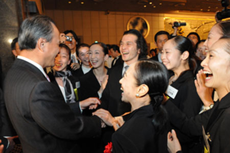 記者在現場看到,日本政經界的許多“大腕”人物出席了招待會。其中有日本參議院議長江田五月、經濟產業大臣直島正行、國家公安委員會委員長中井洽、公明黨黨首山口那津男、前首相福田康夫、中曾根康弘、前經濟產業大臣二階俊博、前自民黨干事長中川秀直、伊吹文明,經團聯會長御手洗富士夫等等。