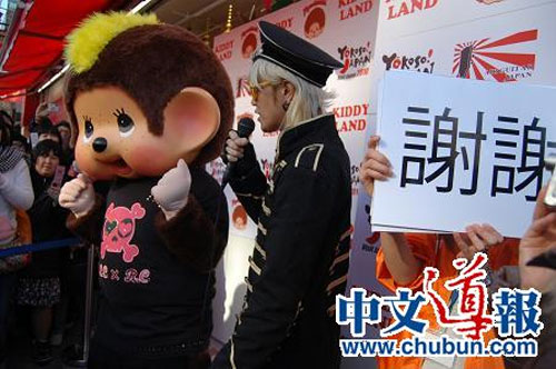 1月30日下午2時,身穿旗袍的主持人小田小姐宣布“Yokoso! Japan year2001年冬季宣傳活動”開始,接著由MAY等“空氣吉他日本”的成員做精彩表演,最后蒙奇奇出場,蒙奇奇的后面有人舉著用中文寫成的展示它的身體語言所表現的意思的牌子,場上氣氛十分熱烈。(張石)
