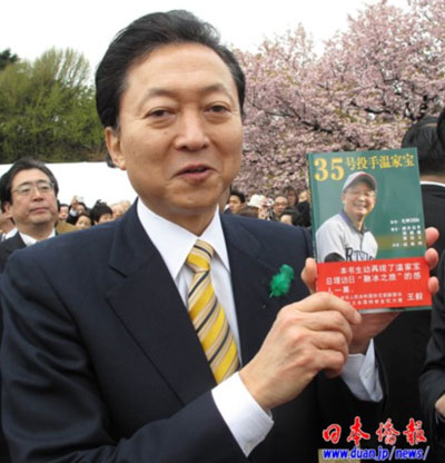 在“賞櫻會”上,受邀參加的日本僑報社張景子社長向鳩山首相贈送了該社出版的《35號投手溫家寶》,鳩山首相欣然收下,并勉勵日本僑報社繼續為日中交流做貢獻。張景子說,“我們來自中國,在日本創辦的日本僑報出版社致力于日中交流,已經出版了200來本書。2008年出版了中日文版《35號投手溫家寶》,今天特地給您帶來了一本!兵F山首相高興地從張景子手中接過《35號投手溫家寶》一書,仔細端詳,并說:“我下個月就要與溫家寶總理會面。希望你們繼續努力,為促進日中交流作出更大的貢獻。”說完,鳩山首相高高地舉起《35號投手溫家寶》一書,讓大家拍照。
