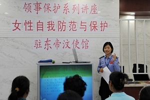 中新網4月26日電 據中國外交部網站消息,4月25日,中國駐東帝汶使館在簽證大廳舉辦領事保護系列講座第二講,題為“女性自我防范與保護”,由中國派駐東帝汶維和警隊的何育芳女警官和聯合國世界糧食計劃署駐東帝汶辦公室副主任趙欣敏女士聯合主講。除僑胞外,傅元聰大使夫婦和使館婦女小組全體成員也出席了講座。