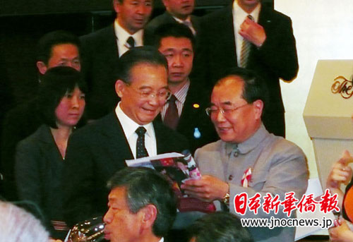 因為這次是溫總理在晚宴現場突然會見姜維,記者事前毫無準備,匆忙之中只能按動相機的快門,記錄下溫家寶總理會見旅日僑胞的一個生動片斷。(蔣豐)