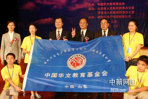 圖為國務院僑辦副主任趙陽、山東省政協副主席王志民、山東省僑辦主任王琳、中國華文教育基金會秘書長杜志濱共同為本次夏令營授旗。作 者:王超