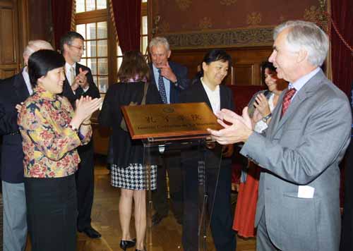 為了表現該城對建立孔子學院的重視,掛牌儀式特別移到拉羅舍爾德市政府大廳舉行。市政廳也是一處歷史古跡,火焰哥特式圍墻包圍著文藝復興風格的建筑主體。特別顯眼的是市政府特意在大門口的歐盟旗和法國國旗旁邊掛上了鮮艷的五星紅旗。為了讓儀式隆重熱烈,除了普瓦圖-夏朗德大區(qū)議會與拉羅舍爾市地一干政要及嘉賓外,市長馬科斯穆•布諾特別邀請了社會各界人士以及當地的華僑華人和留學生等約200人出席當天的活動,把個節(jié)日大廳擠得滿滿的。