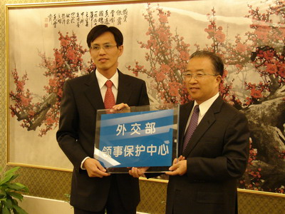 今年八月,外交部副部長戴秉國向領(lǐng)事保護(hù)中心授牌。