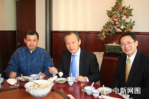 崔天凱大使接著來到中華街上的老字號東榮酒家,和神戶華僑總會會長鮑悅初、株式會社東榮商行代表王銳輝等當地華僑代表一邊吃餃子一邊交談,了解餃子事件的各種負面影響。