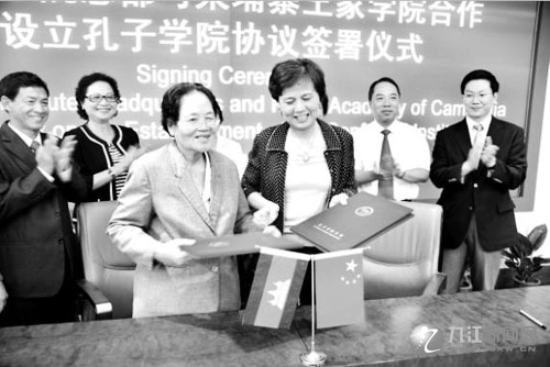 經過近兩年的精心籌備,設立王家學院孔子學院的條件已經成熟,中柬合作雙方加緊履行申辦孔子學院的相關手續。8月12日,應九江學院的邀請并受宋安副總理的委托,柬埔寨王家學院院長克洛堤達博士率王家學院代表團抵達北京,訪問國家漢辦暨孔子學院總部?鬃訉W院總部總干事許琳女士會見了克洛堤達博士,雙方分別代表孔子學院總部和柬埔寨王家學院,簽署了《中國孔子學院總部與柬埔寨王家學院關于合作設立王家學院孔子學院的協議》。至此,柬埔寨第一家孔子學院正式宣告誕生。