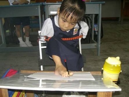 她五六歲在附設(shè)于吉北循正華小的學(xué)前幼兒園開始上學(xué),家人就用特制的畫板式桌子,及舅舅為她度身制作如小童學(xué)步車設(shè)計(jì)、用雙腳操縱的小輪椅,每天攜帶這套特別桌椅到學(xué)校讓她和其他小孩一起上課。