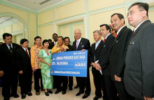 馬來西亞首相納吉(右5)移交300萬模擬支票給叻思華小董事長黃澤桂(馬來西亞《星洲日報》 圖)