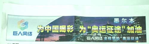 巨人網絡的通欄廣告刊登在7月17日某報第 28版頂端。廣告左邊是公司的圖形標識;右上寫著“墨爾本”;右中寫著大字號的“為中國喝彩 為‘奧運征途’加油” ;右下寫著小字號的“巨人網絡 全程贊助‘奧運征途’”。記者調查發現,“奧運征途”是該報介紹歷屆奧運會的一個專題欄目,本期介紹的是墨爾本奧運會。