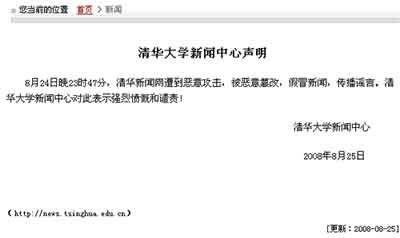 前天,清華大學(xué)新聞中心特為此發(fā)表了一篇聲明,該聲明中稱,8月24日23時47分,清華新聞網(wǎng)遭到惡意攻擊,被惡意篡改,假造顧秉林校長接受采訪的新聞,傳播謠言。清華大學(xué)新聞中心對此表示強烈憤慨和譴責(zé)。目前,清華新聞網(wǎng)已恢復(fù)正常運行。(記者 徐晶晶)