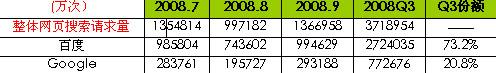 根據艾瑞咨詢的數據顯示,整個2008年第三季度,中國網頁搜索請求量為371.9億次,作為中文搜索領頭羊,百度獨占高達73.2%的市場份額,繼續牢牢占據著中國搜索引擎市場的頭把交椅;而排名第二的谷歌的網頁搜索請求市場份額則僅僅為20.8%。