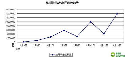 據360安全專家介紹,為避開安全廠商的封堵,周末和夜間時段歷來是木馬產業鏈活躍期。從7月8日到12日期間,不法分子針對微軟MPEG-2視頻0day漏洞的單日“掛馬”攻擊連續出現兩次重大起伏。第一次為9日不到300萬次猛增到10日的1000萬次,第二次則是從11日的400多萬次激增到12日的1381萬次。截至12日15時,此次大規模網絡攻擊已累計導致12081家網站被“掛馬”,“掛馬”網頁總數達91578個,而360安全衛士已累計為用戶攔截了40216987次“掛馬”攻擊。